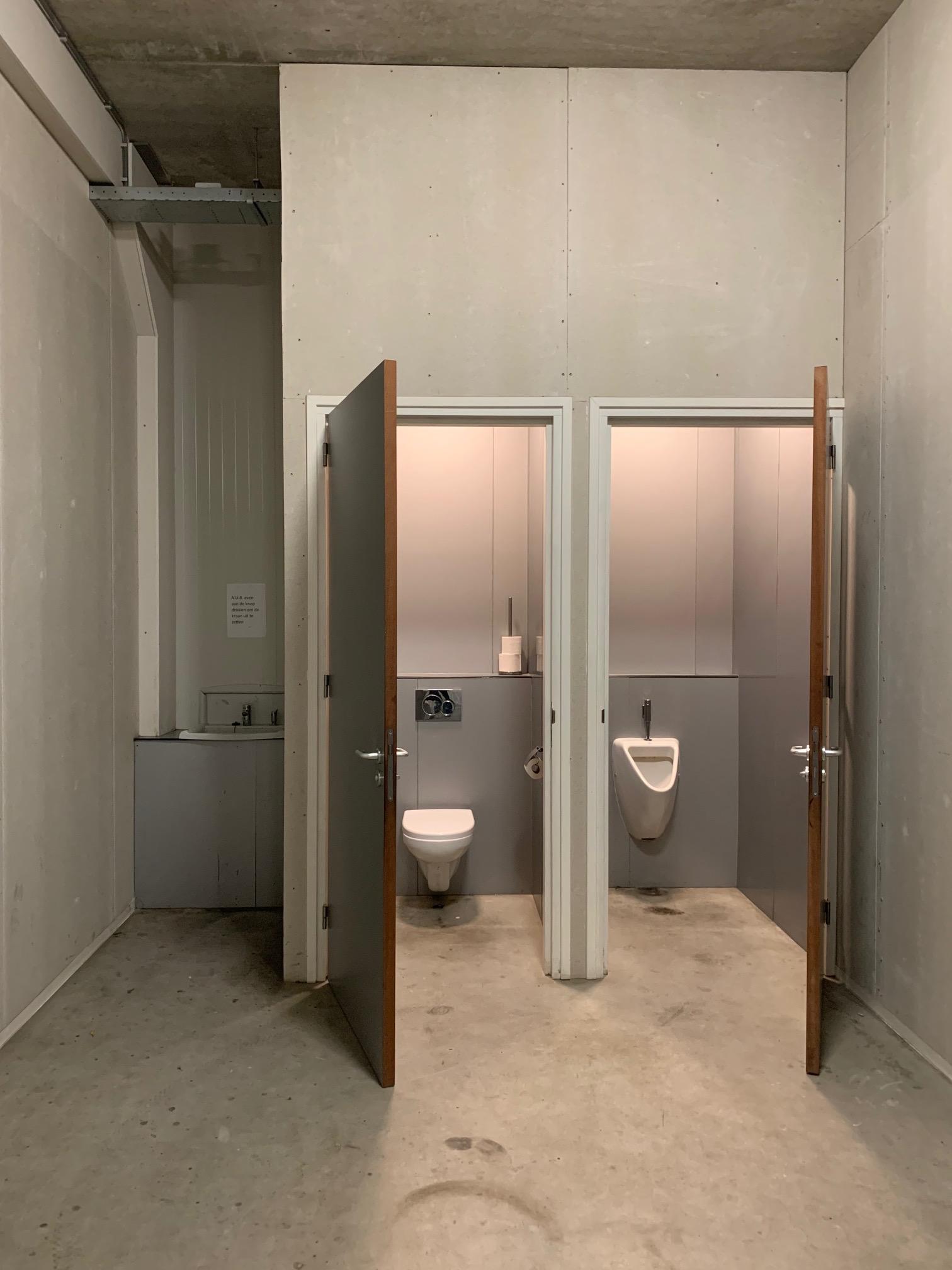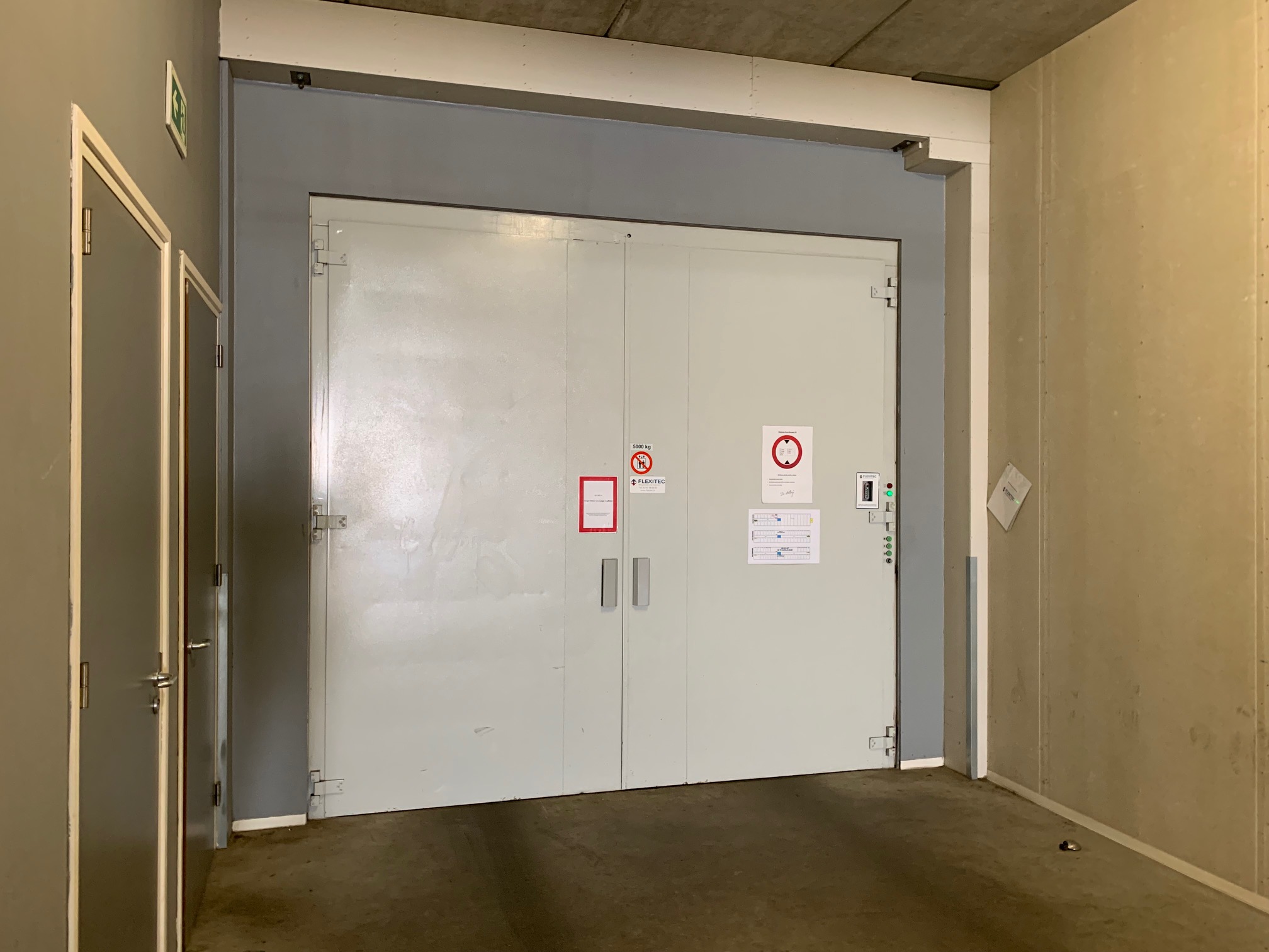 Midden in het gebouw is een brede straat van 3.90m die leidt naar een grote autolift (3.70x7.5m en 2.40m doorrijhoogte) die je naar de tweede verdieping brengt. Centraal zijn er sanitaire voorzieningen aanwezig.