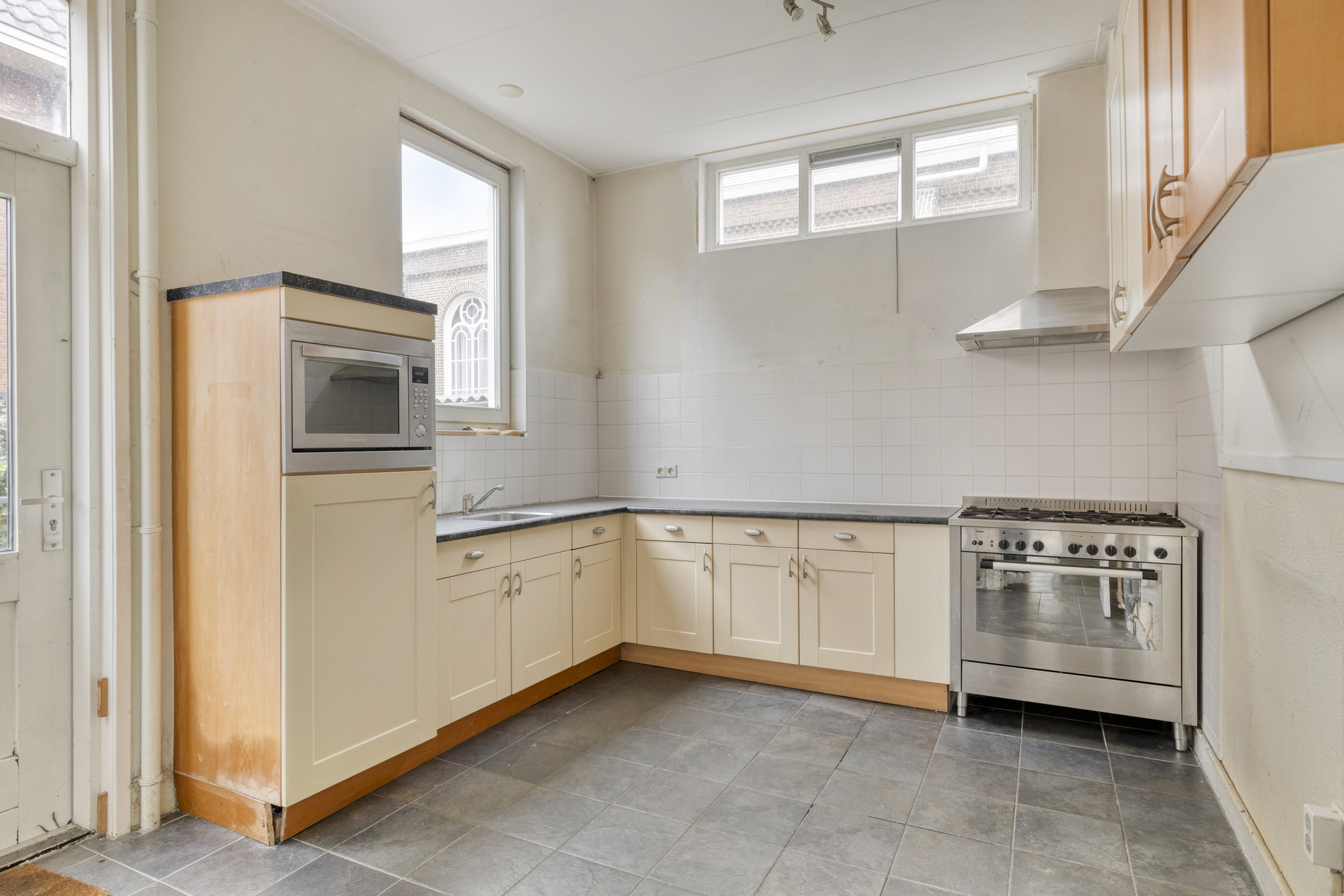 Aan de achterzijde is de ruime woonkeuken van 13 m² gesitueerd met een hoekkeuken voorzien van inbouwapparatuur en de deur naar de achtertuin.